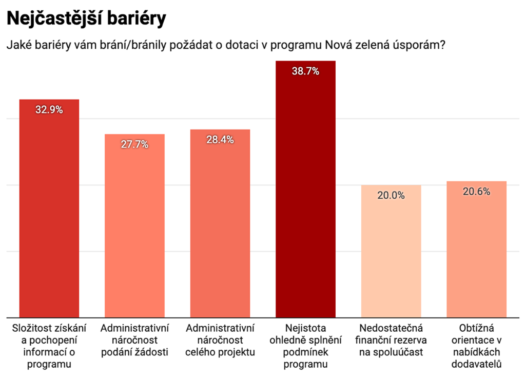 Podle aktuálního průzkumu využila při výměně zdroje tepla dotační program Nová zelená úsporám jen čtvrtina respondentů. Většinu zájemců odrazuje samotný proces, mezi nejčastější překážky patří nejistota ohledně splnění podmínek programu, složitost získání a pochopení informací, nebo administrativní náročnost celého projektu. Pouze 7,7 % dotázaných uvedlo, že při žádosti o dotaci žádné překážky nevnímá. Vyplývá to z průzkumu společnosti STIEBEL ELTRON, který proběhl na konci července. Sběr dat byl realizován prostřednictvím aplikace Instant Research agentury Ipsos.