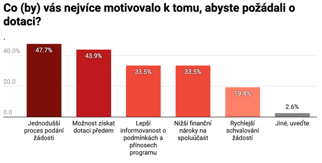 Necelá polovina respondentů označila za nejvýznamnější motivační faktor pro podání žádosti jednodušší proces vyřízení. Pro 43.9 % dotázaných je zásadní možnost získat finanční prostředky předem, tedy ještě před samotnou realizací výměny. Důležitá je i lepší informovanost o podmínkách a přínosech programu a nižší požadavky na spoluúčast, obě možnosti by motivovaly více než třetinu respondentů. Rychlejší schvalování žádostí by přivítalo 19.4 % dotázaných.